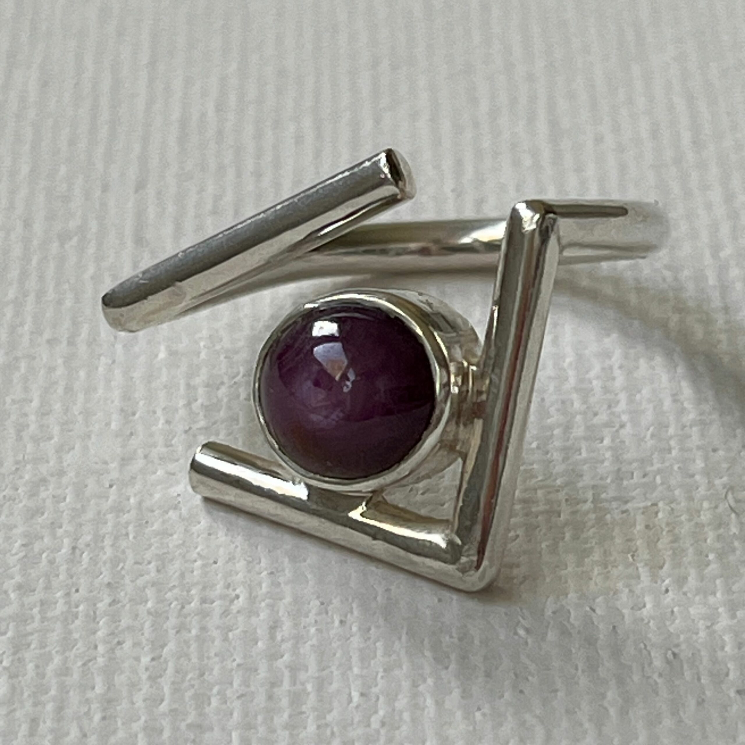 Un cabochon de rubis étoilé est au milieu de cette bague en argent, travaillé 100% à la main.