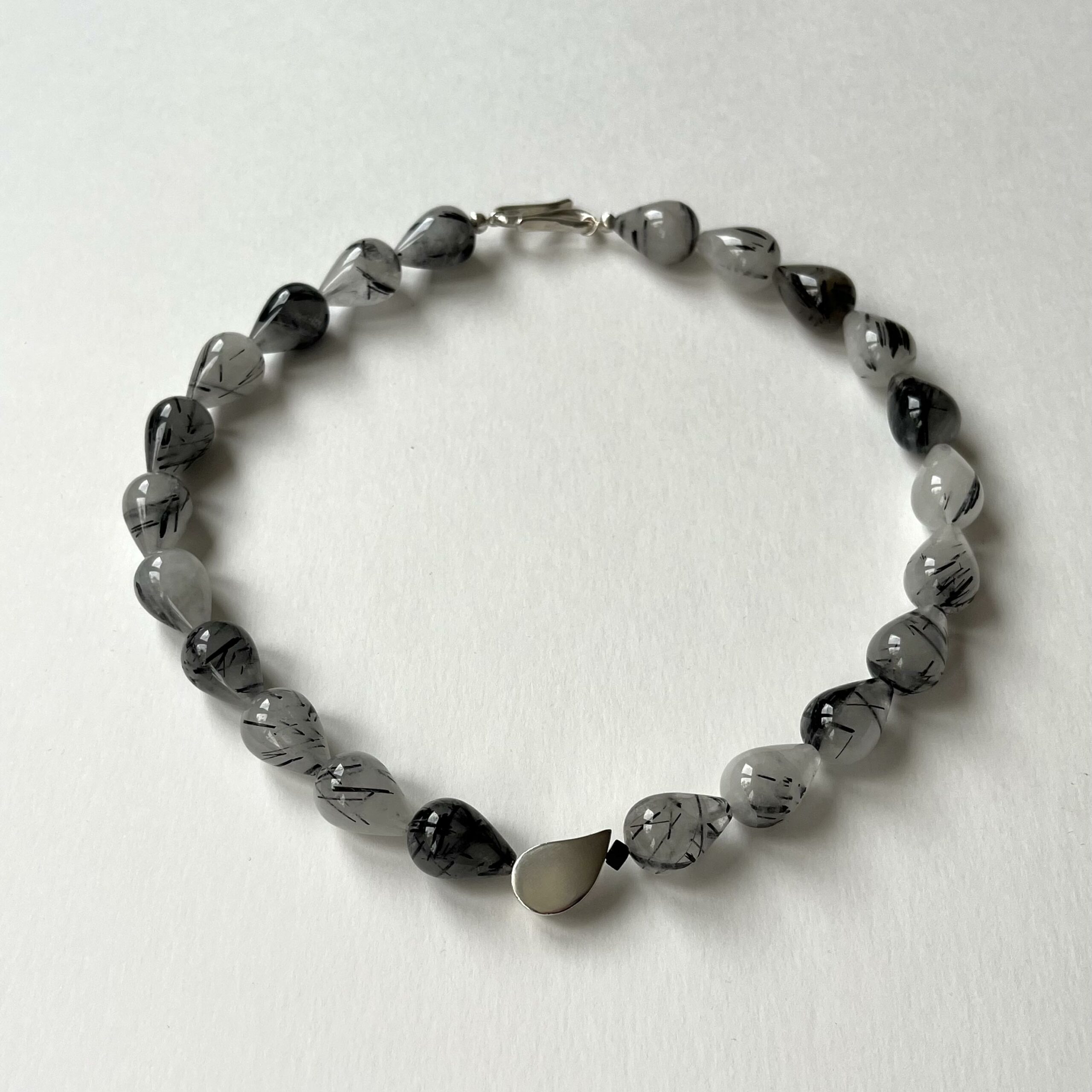 Ce collier en quartz avec des inclusions de cristaux de tourmaline noir a beaucoup de présence. Sa pièce centrale est soudé à la main, ainsi que son fermoir en S. Les perles en pierre ont une longueur de 18 mm.