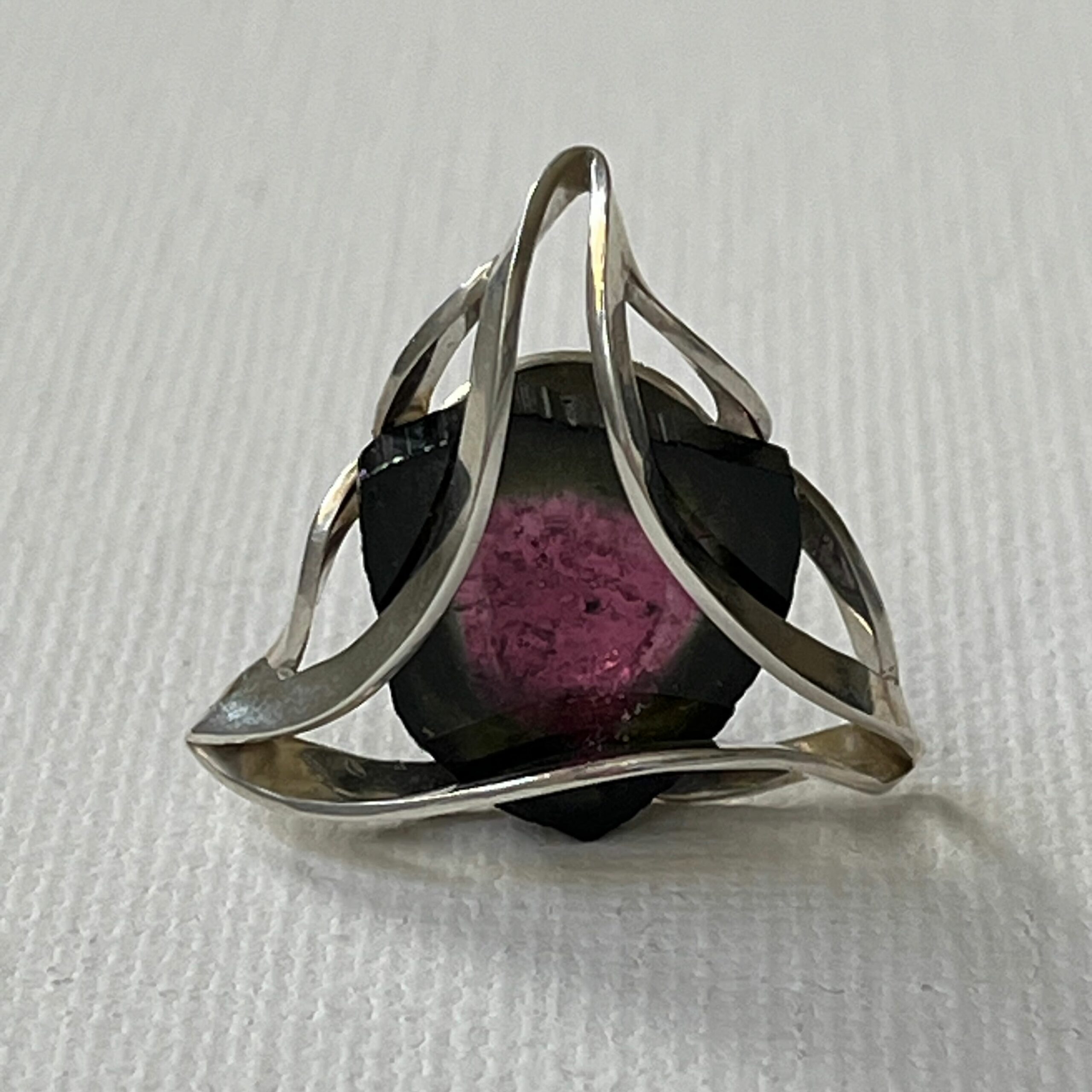 La tourmaline sur ce pendentif TRIGON a une particularité: sa tranche révèle une couleur rouge à l’intérieur et verte à l’extérieur. La forme triangulaire du pendentif rappelle la forme du cristal. L’argent travaillé à la main avec une scie à archet, laisse entrer la lumière de tous les côtés. La fabrication est réalisée en France, dans mon atelier.